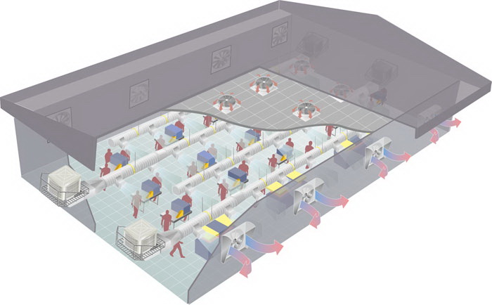 整體降溫將帶給整個(gè)廠房最大的舒適度,尤其適合工人工位不固定,需降溫的設(shè)備或物品流動(dòng)性大的車(chē)間。