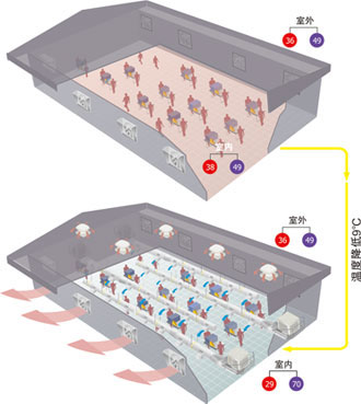 當(dāng)室外溫度為36℃、相對(duì)濕度為49%時(shí),有熱源產(chǎn)生的車(chē)間內(nèi)溫度達(dá)到40℃、濕度49%,當(dāng)使用環(huán)保空調(diào)開(kāi)放式降溫系統(tǒng)可將溫度降到29℃、濕度70%,車(chē)間溫度降低了11℃。