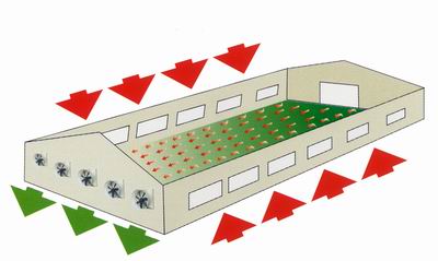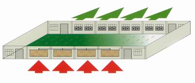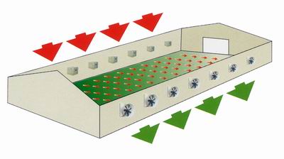 水簾墻與負(fù)壓通風(fēng)技術(shù)結(jié)合是騰煌成功技術(shù)之二,免去了降溫設(shè)備音量及維修的煩惱。此技術(shù)不但費(fèi)用低,而且降溫效果好。
