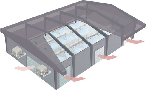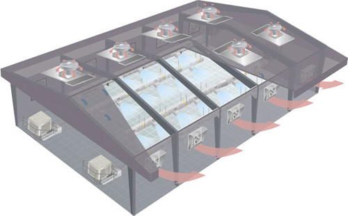 封閉式廠房空氣排出完全受到限制。 完全依靠機械排風(fēng)排出空氣。