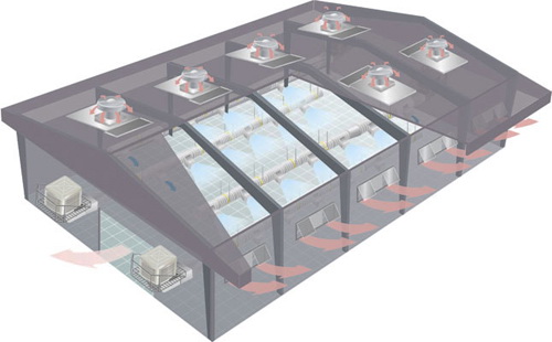 在半封閉或全封閉的廠房,含濕量會增加。因此,送入的冷風(fēng)必須由機械排風(fēng)形式排走而將空氣的含濕量保持在最低值。