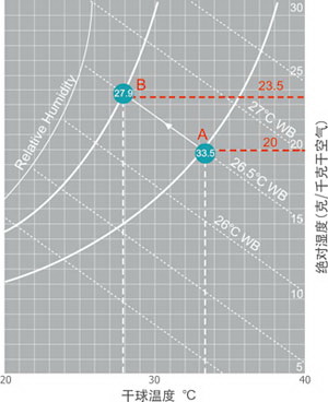 對濕度增加的關(guān)注主要原因是絕對濕度和含濕量的增加,例如:當(dāng)空氣從A點降溫到B點,含濕量從20克/千克干空氣增加到23.5克/千克干空氣。增加量雖然很小但必須要加以控制。