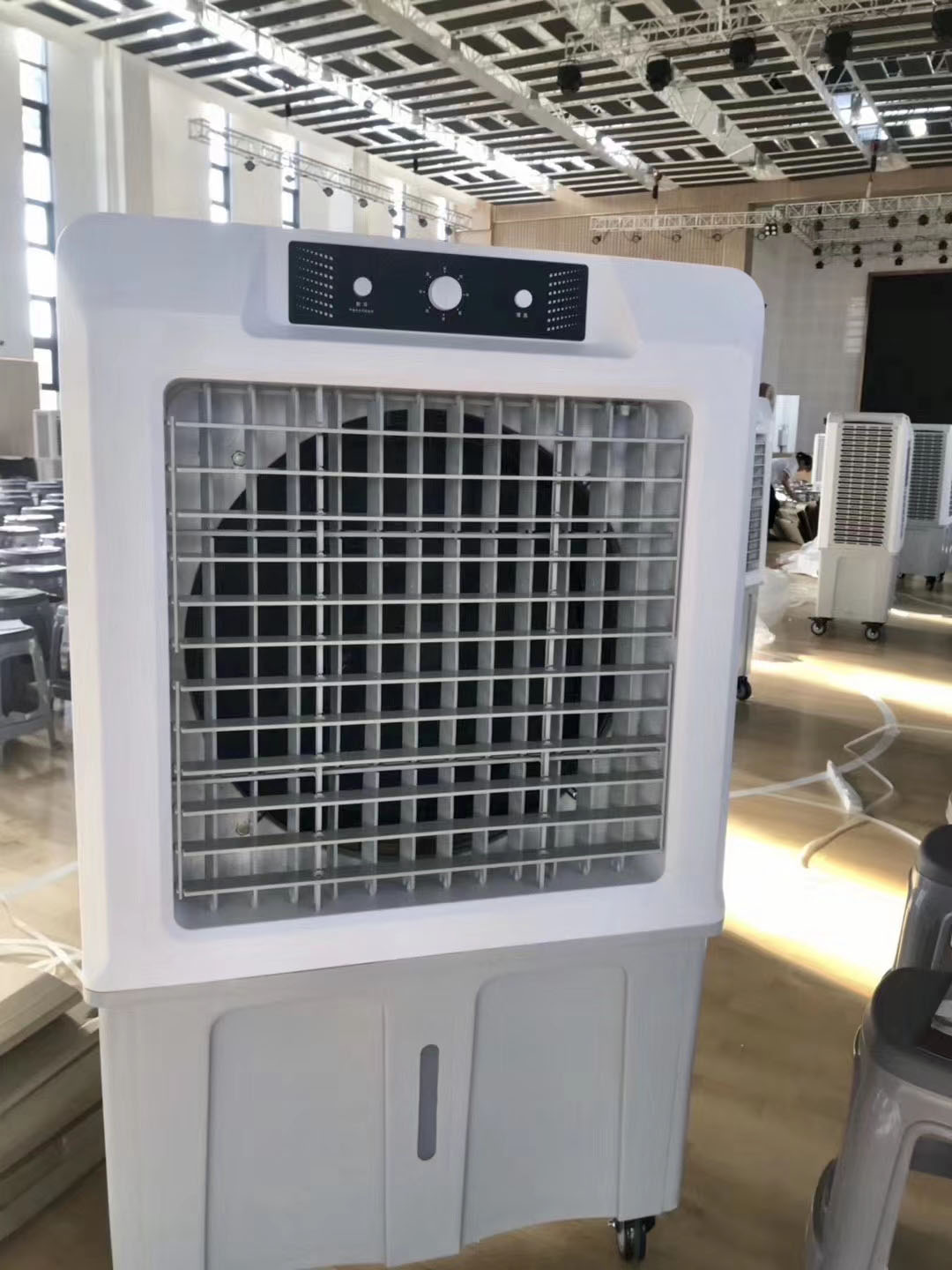 高大空間通風換氣方法辦法每小時57.5次將近每分鐘1次的換氣次數(shù)就騰煌節(jié)能環(huán)??照{(diào)的特點,水冷空調(diào)TH-23A功率僅為1.5KW,一般的工廠車間只需要不到30次/時的換氣次數(shù),那么一臺水冷空調(diào)23A就可以滿足130-200平左右的車間通風降溫的需求。服務(wù)熱線13316055627