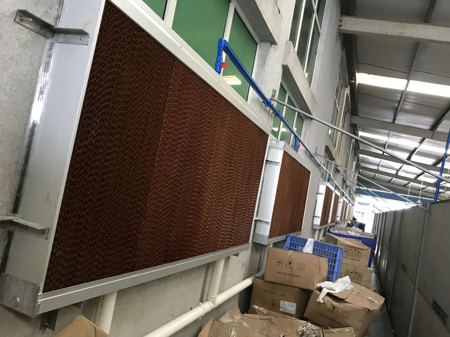 工廠水簾佛山工廠降溫水簾,水簾冷風(fēng)機,之所以受到廣大客戶的歡迎,是名副其實的,來了解一下它的降溫原理!負壓風(fēng)機用于把室內(nèi)的污濁、熱空氣抽走,而安裝在負壓風(fēng)機對面的水簾墻則用于進風(fēng)。室外的新鮮熱空氣在經(jīng)過水簾墻被淋濕的小孔時,與水發(fā)生熱交換而被過濾和降溫。風(fēng)機與水簾墻的配合,人為的再現(xiàn)自然界水份蒸發(fā)降溫這一物理工程,耗電量只是傳統(tǒng)空調(diào)的十分之一。