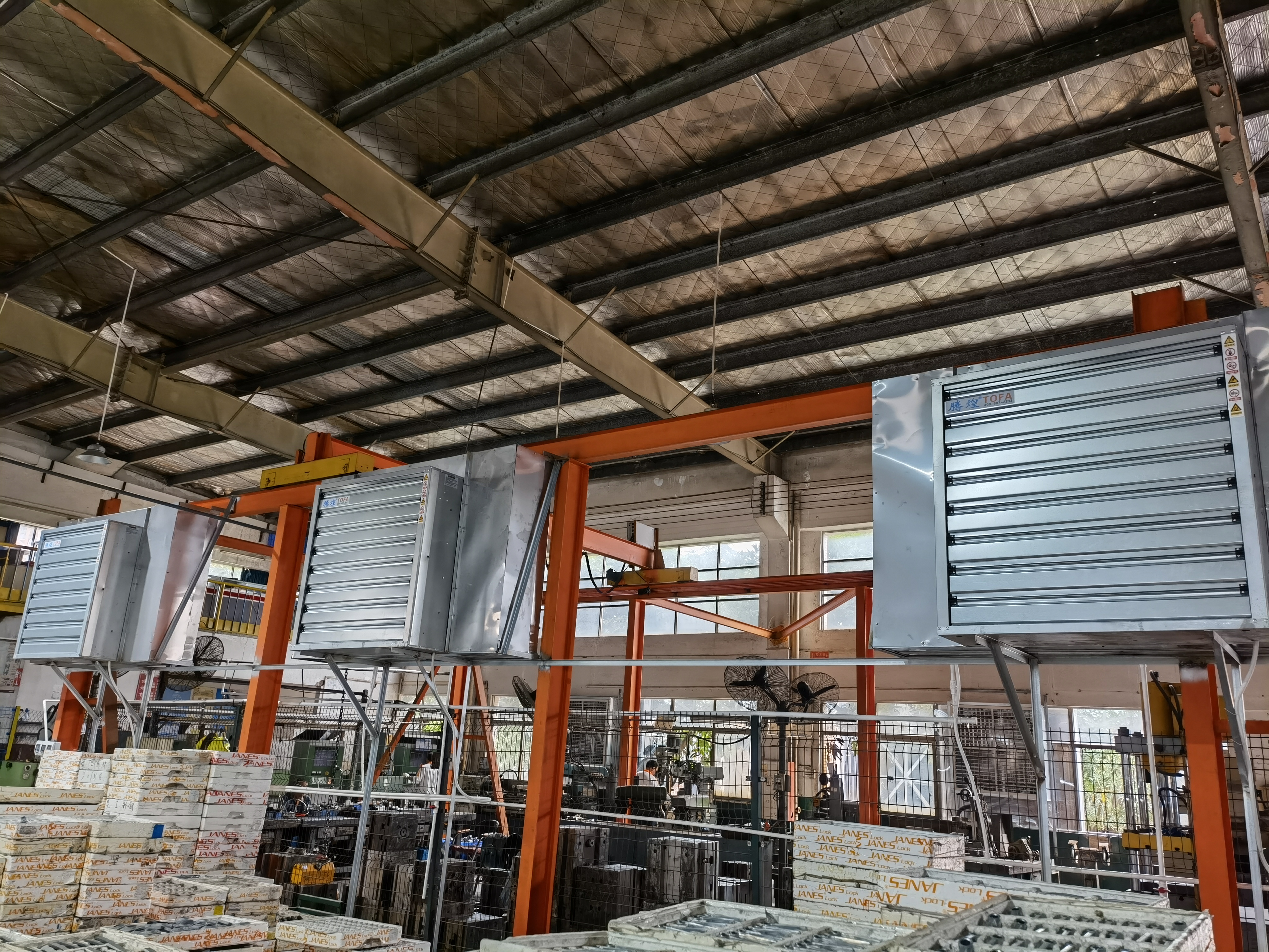 廠房通風(fēng)換氣系統(tǒng)騰煌負(fù)壓排風(fēng)機(jī):利用廠房側(cè)墻安裝負(fù)壓風(fēng)機(jī),按照車間換氣次數(shù)40次以上設(shè)計(jì);車間進(jìn)門處和對(duì)面窗戶自然補(bǔ)風(fēng),達(dá)到空氣流動(dòng),使車間高溫和污染空氣排到室外,自然補(bǔ)風(fēng)的室外新鮮空氣進(jìn)入車間達(dá)到循環(huán)系統(tǒng)。該方法較簡(jiǎn)單實(shí)用,投資少,使用成本較低,使用效果對(duì)車間溫度要求不是太高的工廠可以使用。