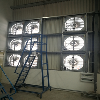 在工業(yè)廠房實(shí)踐使用中,騰煌負(fù)壓風(fēng)機(jī)通常安裝于廠房一側(cè),進(jìn)氣口于廠房房另外一側(cè),空氣由進(jìn)氣口到負(fù)壓風(fēng)機(jī)構(gòu)成空氣對(duì)流。